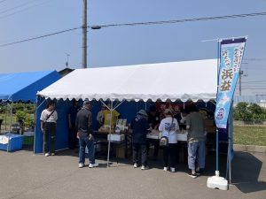 午前中は田んぼアートやキャンプ場、パークゴルフ場が併設されているパレットヒルズなどを案内していただきました。そこの展望台からは大雪山連峰を一望でき、圧巻の景色でした。その後、北野コミュニティセンターに移動し、ふれあいスポーツデーでの浜益ブースのお手伝いに参加しました。石狩市浜益の名産品や、その場で焼いて食べることができるたこの販売などを行いました。