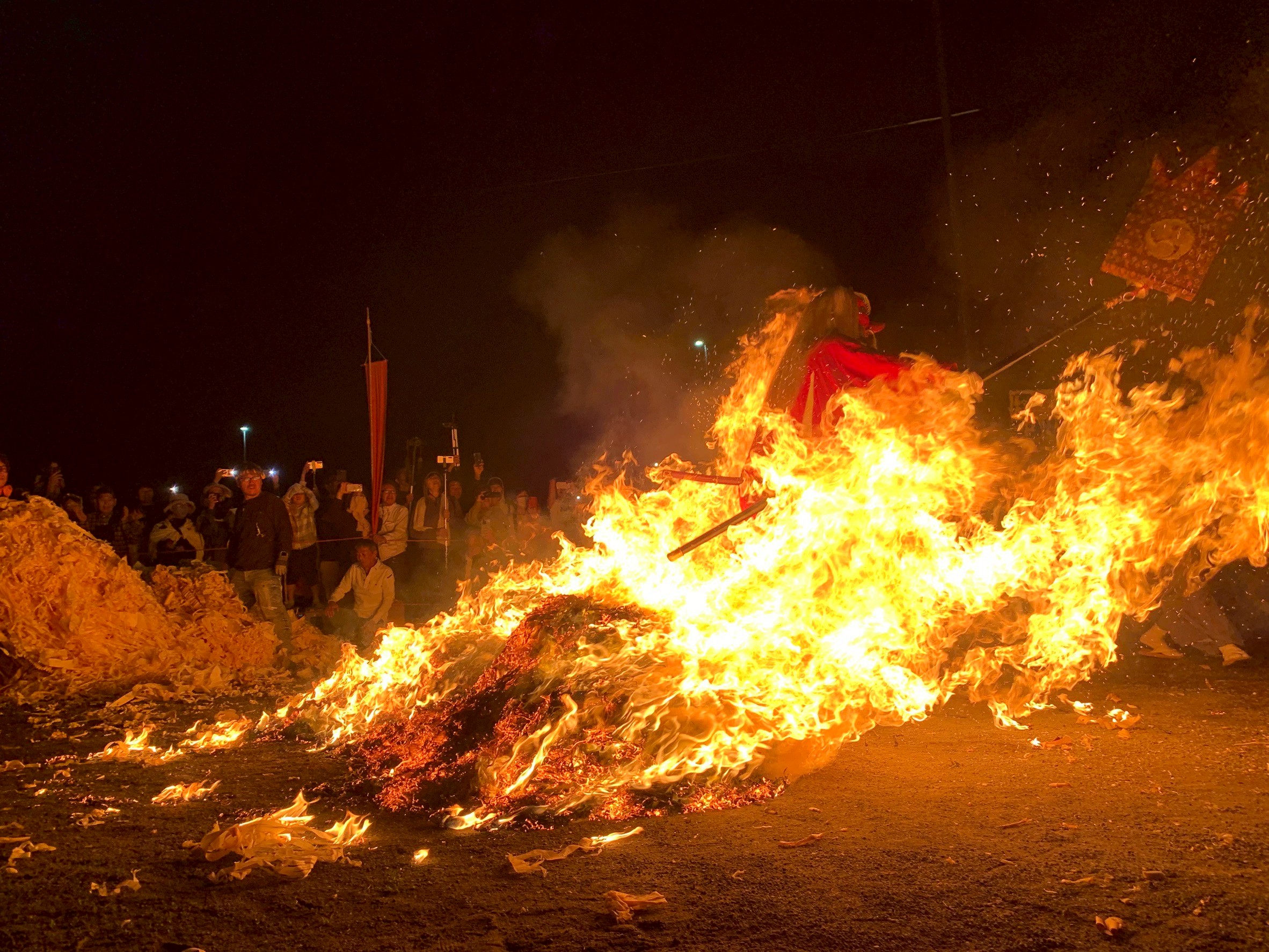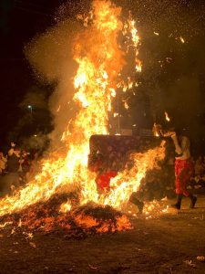木の削りカスに着けられた炎は、自分の身長よりも遥かに高く燃え上がっていました。奴(やっこ)はその炎を囲んで待機しますが、その場にいられなくなるくらいの熱気に包まれ、あまりの高温に距離を置く人もいるほどでした。そんな激しい炎の中を天狗や獅子、神輿が通り抜けます。通り抜けるだけでなく、場内を煽ってさらに炎を激しくしていきます。この炎の中を通ることで、町内を歩いて集めた穢れや災厄を清めるという目的があるそうです。炎の中を通っていく人々の勇気に、心が奮い立たされました。