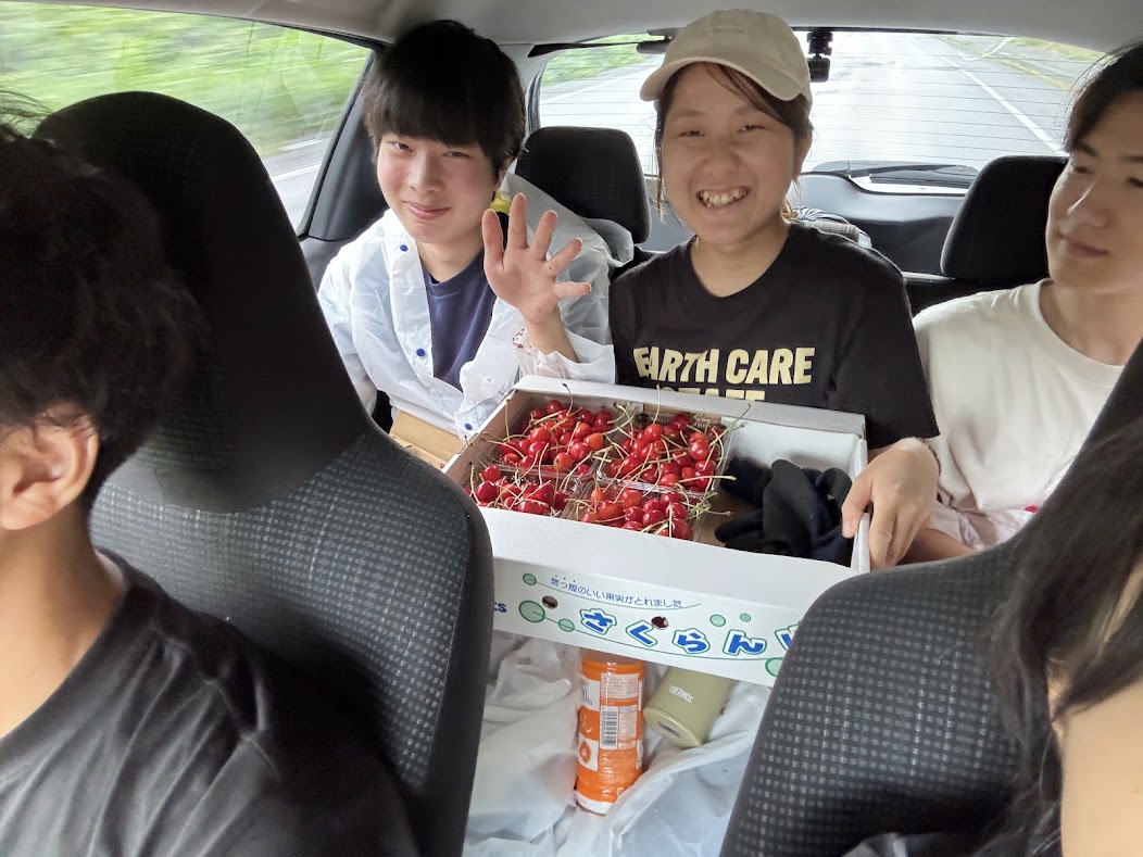 私は日帰りで参加しました。お昼はキャンプ場で冷凍さくらんぼを販売し、キャンプに来た方と会話したり、仲間とキャンプご飯を作ったりと、にぎやかで楽しい時間を過ごしました。午後ははまますベースで草刈りを行い、そのあとはさくらんぼの収穫を体験しました。雨空の下での作業は大変でしたが、枝先にたくさん実ったさくらんぼをひとつずつ丁寧に収穫していく作業は、夢中になるほど楽しかったです。手作業ならではの達成感と、都会では味わえない自然の中での時間の豊かさを実感し、また浜益に訪れたいと思える一日になりました。(あっくん)