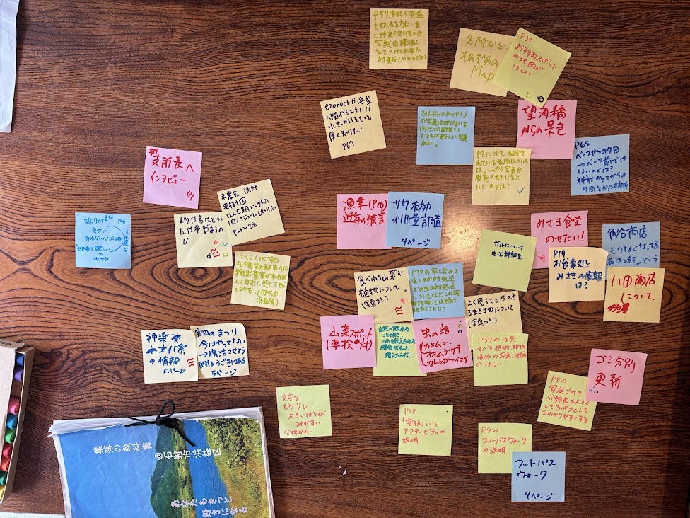 浜益の関係人口へ情報発信のために作成された『集落の教科書』について、第2版への改訂作業に向けたワークショップを実施し、参加者同士で改善点について意見交換を行いました。