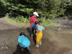 その後は、鶏にあげるえさを作ったり、こおろぎやカマキリを捕まえたり、芝生に寝転んでみたり、泥団子を作ってみたり、水たまりでちゃぽちゃぽしてみたり。