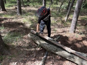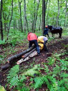 午後からは馬のナナの協力のもと、馬搬を行いました。先日伐採していた木を運びました。私たちは運びやすいように木をまとめる作業を行いました。ナナの機嫌も良かったようで、運ぶ量がたくさんあったのにも関わらず、あっという間に運び終えてしまいました。複数人の大人で一生懸命まとめた木々をナナ1頭で運んでしまうので、力持ちなナナにほんとうに感謝です。