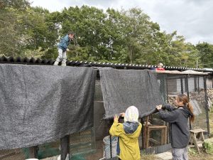 ご飯を食べたら、みんな元気もりもりに作業再開です!まずは、鶏小屋に元々ついていた日よけシートの撤去を行いました。小屋の屋根に上ってドリルを使っている様子はとてもたくましかったです。