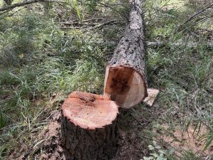 今回の月に一度は森づくりは、馬搬(伐採した木を森の中から馬が運び出すこと)がメインの一日でした。そのため、いぶり自然学校から置戸町にお引越ししていた馬のナナが出張で戻って来てくれていました。前日から木を切り倒していたようでしたが、当日の朝も木を切っていました。僅かな穴からアリがたくさん出入りしている様子を見つけて、そこからこの木はまもなく腐ってしまうと予測して、切る木が決められていました。実際に切り倒してみると本当に中に空洞ができ始めていて、驚きました。言われるまでアリが出入りしていることにも気付けなかったので、普段から森を見ているからこその観察眼に感動しました。