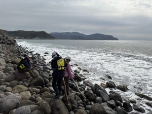 そして、締めは海です。ライフジャケットをつけて安全対策は万全に!郷土資料館の下にある海で遊びました。カニを見つけたり、シカの骨を見つけたり、陸地とは違う発見に子どもたちもはしゃいでいました。そして、一番興味を引いたのは、海の波です。波が寄せては返す様子に大盛り上がり!しっかり遊んで、しっかり濡れて、3日間のフィナーレにふさわしい時間でした。