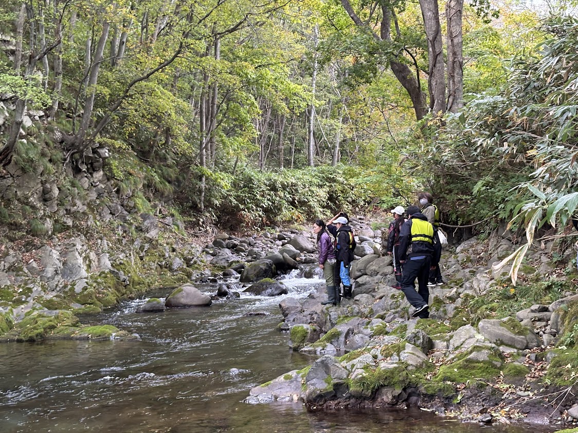 収穫体験を終え、お昼を食べた後、果樹園の裏にある川を見に行きました。鮭が遡上している時期だったこともあり、子どもたちは鮭が泳いでいないかと川の中を一生懸命探していました。すると、運よく泳いでいるサケを発見!子どもたちは大喜びでした。