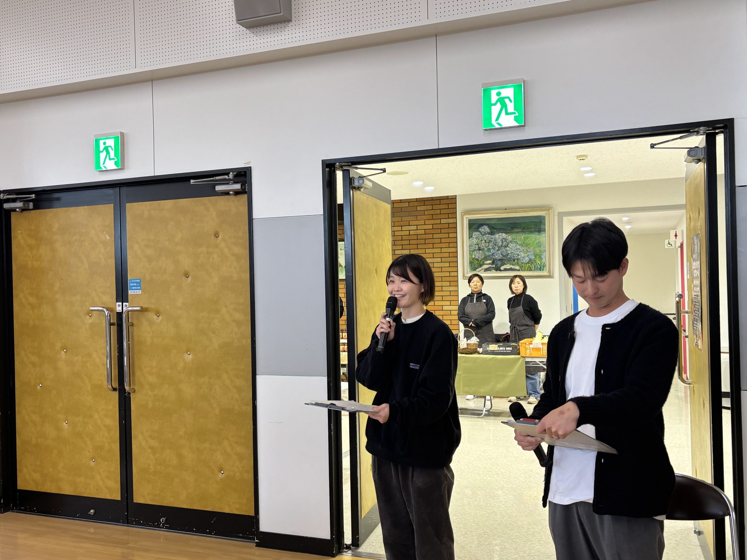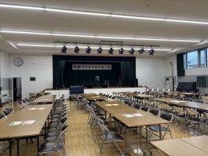 今回私たちは、北野地区で行われたカラオケイベントの運営のお手伝いをさせてもらいました。まずは昼食に鷹栖牛のハンバーガーをいただき、腹ごしらえをした後に資料の作成や打合せを行いました。その後、今回のイベント運営に関わるメンバーが揃い、みんなで会場設営を行いました。テーブルや椅子、飲み物などが並び、何も置かれていなかったホールから一気にイベント会場へと変身しました。
